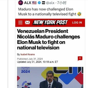 【如果马斯克输了,跪下唱征服?】马杜罗约战马斯克,要求来一场电视直播对决,没想到马斯克应战,并在社交媒体上表示:如果我赢了,马杜罗下台。如果他赢了,我免费送他去火星!